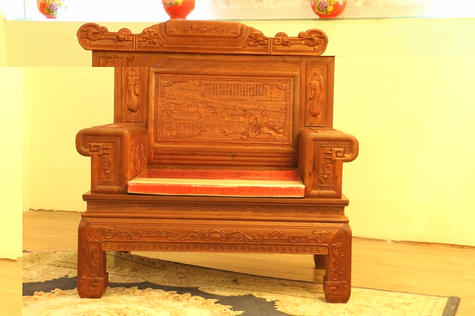 該款沙發整體之表現顯得極為嚴密厚實,無一處鏤空之雕飾,在最上端背板處的中間部分為留有一些花紋之邊幅加以修飾,顯得極為浮美雅觀。而在其左右兩側則另雕繪有“麒麟戲珠”與“雛鳥朝鳳”兩處紋飾圖案:“麒麟戲珠”紋飾設計地較為特別,如草龍紋一般,除頭部精細雕刻外,其余四肢與形體均簡略化,身體部位采用一銜邊條帶狀的紋飾相串于圓珠內,頗顯靈動神韻;而“雛鳥朝鳳”的圖案則是在背板最上部的左右兩端,末端是饒有一圓弧之設計為修飾收尾,顯得極為婉轉柔和圓潤。紋飾的圖案為一只可愛的雛鳥深情脈脈含情注視著前方鳥鳳的場景,顯得實為溫馨。鳳凰處之設計處理地也與前面麒麟一同:頭部細化,其余簡略帶過,鳳凰處眼眸之雕飾顯得極為醒目,神情表現形態逼真,層次感和手觸感亦十分明瀝彰顯,而經燙蠟處理的表面緬花材質表現地也更為細膩淡雅,極盡奢華。