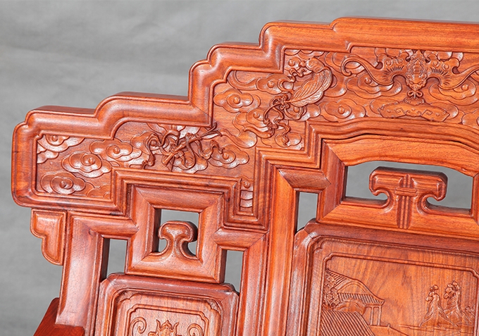 最后,來說說背靠板最上端部分的那綿延浮縷、緊密嚴挨著的充斥于其間的祥云云海紋飾。該處圖案可以說是整體沙發圖案中最為驚艷也是最為惹眼的一處了,在這其中也還另在正中位置處雕繪有寄寓幸福之意的蝙蝠紋;以及下方銜掛有的“磬”紋(磬——它是中國古代宮廷的打擊樂器,形有大有小,上方刻有花紋,并鉆孔懸掛于架下,用以擊打傳聲,其聲響通透清亮極為悅耳);左右兩側板面另還雕飾有幾處寄寓福壽平安之意的道八寶紋飾,從左往右分別是魚骨、羽扇、寶葫以及玉板四處。整處圖案雕飾于呈階梯式層層遞進延伸之外輪廓,銜駕于最上端背板之上,在呈現美好寄寓的同時也同樣有著寶座威嚴、尊貴之氣勢,也更適合擺放在平常家中使用。
