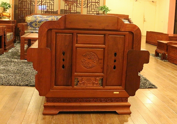 接下來我們來看看沙發(fā)各處的具體細節(jié),遠看單人座沙發(fā)整體給人的感覺就好比一含苞待放鮮艷嬌貴的花朵,木質(zhì)構(gòu)造處的座椅面顯得十分地低矮,以及加上高度近乎不計的椅腳設計,使之整座沙發(fā)的氣韻更顯柔美婉約;左右“兩片”向外伸展而開的扶手就好比那光艷的花瓣一般,給人以無限的遐思,正前方處象征著“富貴”之氣的牡丹浮雕紋飾脫穎而出,雕刻紋理處理溫柔細膩清晰,盛開在沙發(fā)座椅的前方,顯得極為秀麗惹目;沙發(fā)最上端部分的靠背板呈現(xiàn)以一“凸”字形設計,拐角處處理圓潤平滑,而在其前方位置處也還另雕繪有一欄邊幅牡丹花紋,走筆于其板面邊緣,綿延而浮縷于不絕,富貴嬌艷。最后再說說沙發(fā)的背面部分,一框整而平易的木面之上,內(nèi)嵌有一“H”型字母形狀的邊幅,正中央方形位置內(nèi)還幅畫有一圓形的牡丹花卉紋飾,大略也呈上下對稱分布,而在其方形木面的下方,也還雕飾有些許鏤空留余的一朵大牡丹紋飾,上下兩處雕飾與整體沙發(fā)所要闡述的“富貴”主題風格所暗合,花開富貴。