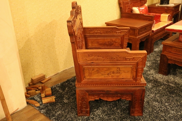沙發(fā)的座椅面平整光滑,極盡原木材質(zhì)紋理之視覺感受;側面扶手處無任何鏤空面積之留飾,嚴實而框整,整體框架為矩形外觀設計。扶手上端正反兩面位置處,同樣雕繪有上處靠背板處鳳凰圖案形狀之紋飾,扶手底部正反兩面位置則雕繪有一些商周時期使用的器具,如斟酒器、編鐘等。