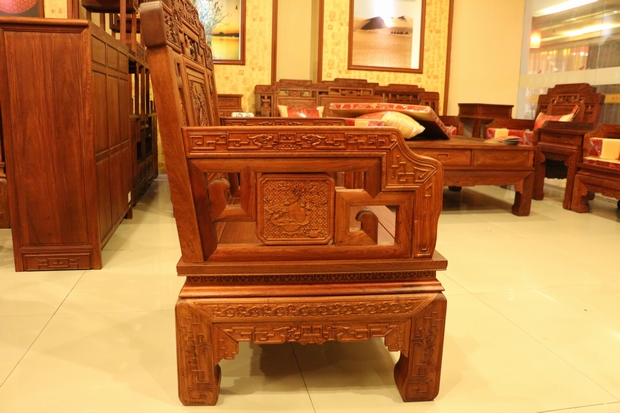 關于該款沙發其他細節各處的特點,也都大致和上述兩件部位風格保持了一致,雕刻紋理雋永而秀麗,外形設計高矮有一,渾然一體,都是以其物美闡釋該系列沙發”福到”這一共有主題,表露了神韻,也寄托了情感,都是居家擺放,裝飾添覽,展示主人高尚情懷與追求的紅木沙發佳品。