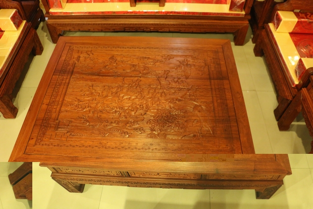 為什么筆者要重點介紹這一張大平幾呢,原因就在它的正上方,在其表面處刻畫有該款沙發中最為別致艷麗,曠古絕美的紋理圖案——“八仙過海”圖。倚靠著那精細、生動,盡筆勾勒描繪出來,雕刻木紋的一絲一畫,我們可以看見:那洶涌澎湃的海水,激打出來的,那一層又一層高高的海浪;還有在其海浪的上方,則是那八位神通廣大的仙人各顯神通,一起漂洋過海而去的生動畫面,各處細節處展現得十分惟妙惟肖,形態逼真,優雅而別致,完整地刻畫了這一幅只有在神話故事傳說中才能聯想到的壯偉畫面,仿佛令人身處畫中,意猶未盡…